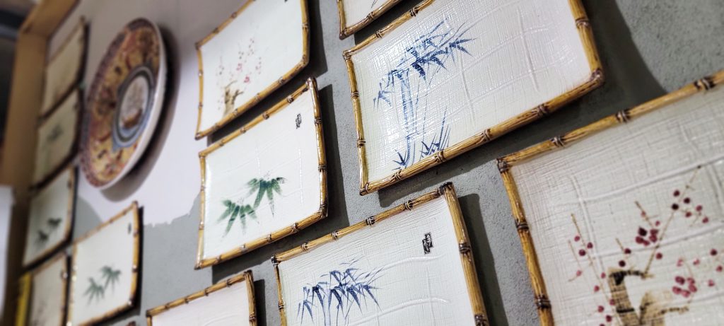 特徴的なのは壁面に飾られたお皿の数々。このお皿は本物のお皿を壁面にあしらっているので質感、デザインも和のあたたかみを感じると思います。また店内に配置された数々の置物は蕎麦に由縁のあるものや縁起担ぎの神様であったり、昔はよくあったハリセンボンの提灯など懐かしさを加持させてくれるもので皆様をお出迎えいたします。
